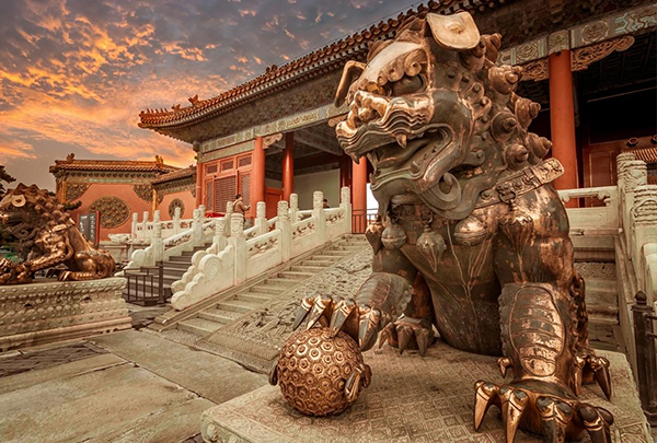 En las puertas, se encuentran estatuas de leones chinos, que aunque parezcan iguales, los leones tienen una pelota entre las patas y las leonas un cachorro es la ciudad prohibida